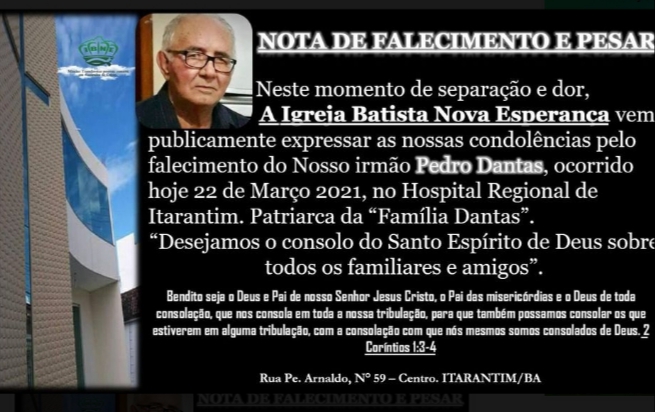 “INFORMAMOS QUE O CULTO FÚNEBRE SERÁ REALIZADO AS 16HS NO TEMPLO DA IGREJA BATISTA NOVA ESPERANÇA, SEGUINDO AS MEDIDAS RESTRITIVAS E SANITÁRIAS. O SEPULTAMENTO OCORRERÁ AS 17H”