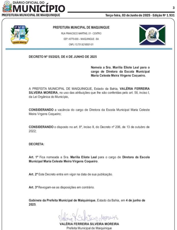 A redação do Crônicas fez uma busca do Diário Oficial da Prefeitura de Maiquinique, a professora em questão, identificada como Marília Eliote Leal, (veja abaixo) conforme consta em seu decreto de nomeação, foi designada diretora de uma escola em Maiquinique pela prefeita daquela cidade. A nomeação ocorreu em 4 de junho deste ano.