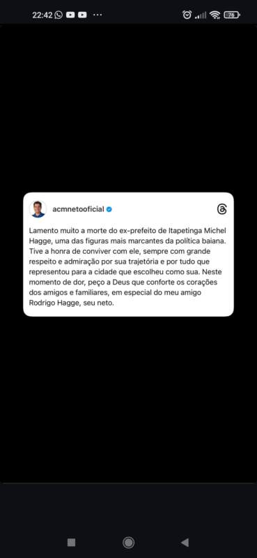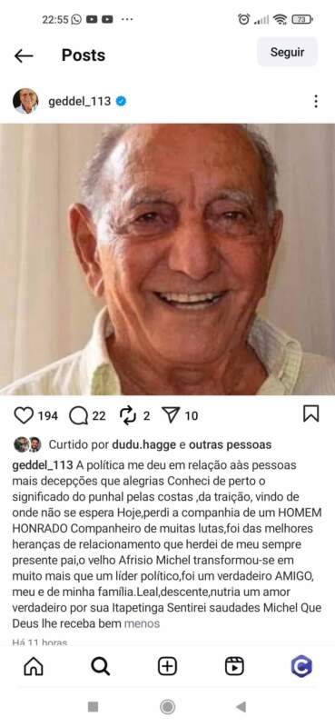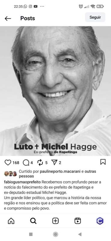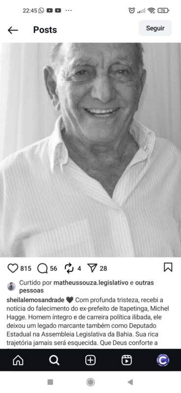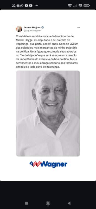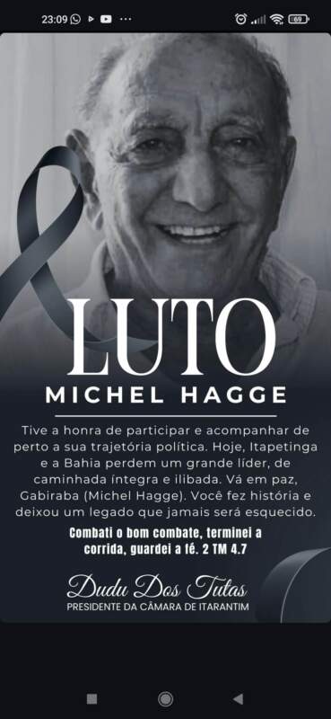 Políticos da região e Bahia, como o governador Jerônimo Rodrigues, prestaram homenagem através de suas ao ex-prefeito de Itapetinga, Michel Hagge, que faleceu nesta quarta-feira, 1º de outubro.