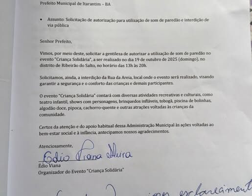A Prefeitura de Itarantim decidiu embargar um evento (Criança Solidária) que seria realizado no distrito de Ribeirão do Salto neste domingo, 19 de outubro, em comemoração ao Dia das Crianças. O evento, organizado pelo grupo “Itarantim Pode Mais” em parceria com os moradores Édio Viana e sua esposa, estava programado há vários dias e incluía a entrega de brinquedos, teatro infantil, show ao vivo com personagens, pula-pula e diversas brincadeiras.