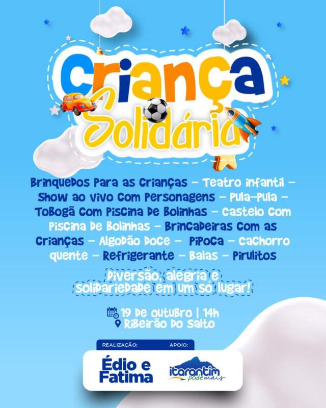 Informamos que o evento Criança Solidária, que estava programado para acontecer no dia 19 de outubro (próximo domingo), foi cancelado devido à negativa do alvará pela gestão municipal.