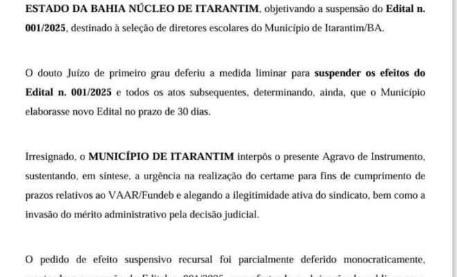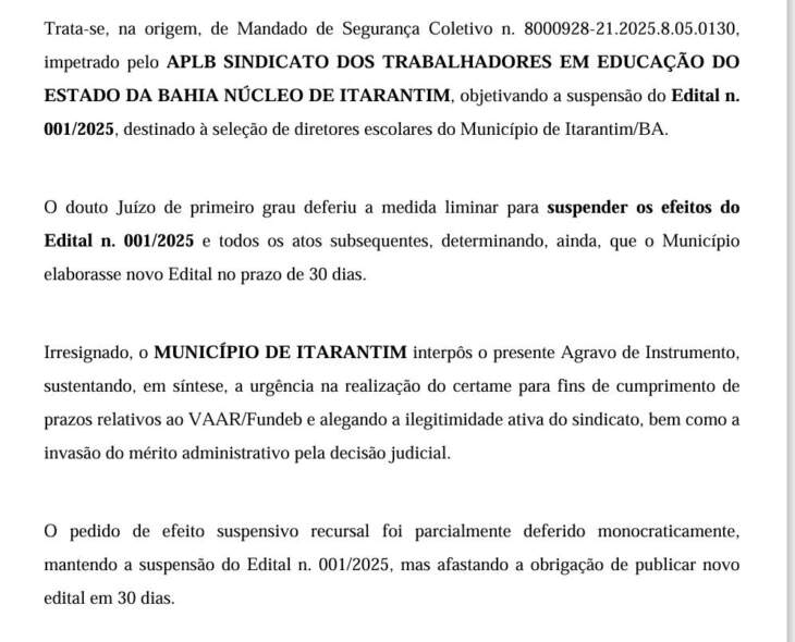 O Município apresentou recurso por meio de agravo de instrumento, porém o Tribunal negou provimento, preservando integralmente a decisão proferida pelo juiz da Comarca de Itarantim. Segundo o entendimento da Corte, os elementos apresentados pela APLB demonstram falhas suficientes para justificar a suspensão das nomeações.