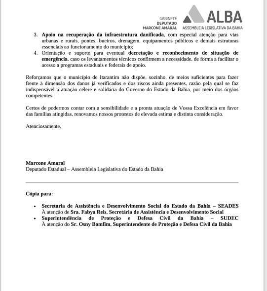 Em contato com a redação do Crônicas de Itarantim, Almeida afirmou que acompanhou a situação durante a noite e, de imediato, enviou o ofício ao deputado. Ele ressaltou que essas ações visam mobilizar forças estaduais para atender rapidamente a população afetada de Itarantim.