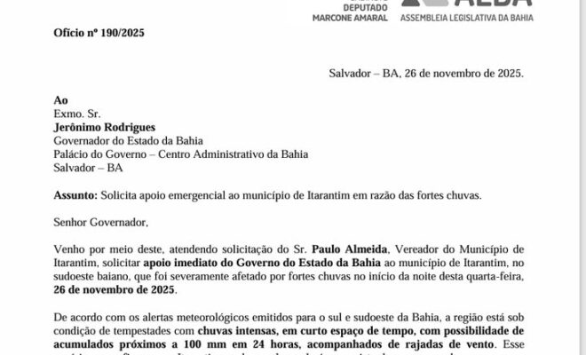 O ofício, enviado por Paulo Almeida, chegou ao gabinete do deputado, que prontamente solicitou ao governador da Bahia, Jerônimo Rodrigues, soluções imediatas para os problemas causados pelas chuvas, que afetaram residências e deixaram algumas pessoas desabrigadas.