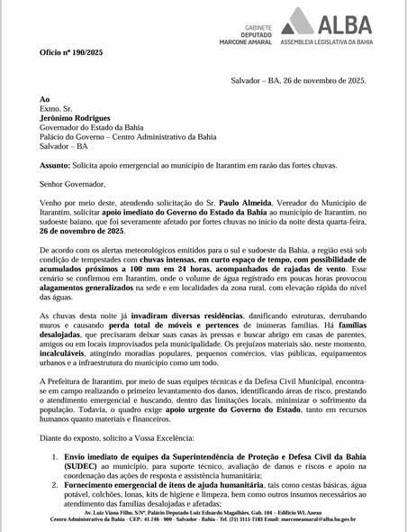 O deputado Marconi Amaral, do PSD, atendeu a um ofício do vereador Paulo Almeida, solicitando medidas urgentes devido às fortes chuvas que atingiram o município de Itarantim nesta quarta-feira, 26 de novembro.