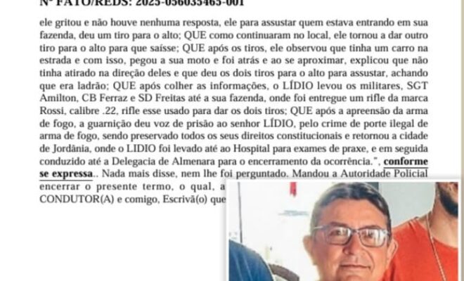 De acordo com o boletim, dois agentes da Polícia Militar foram até a propriedade do secretário, onde apreenderam um rifle calibre .22, e ele foi conduzido por porte ilegal da arma.