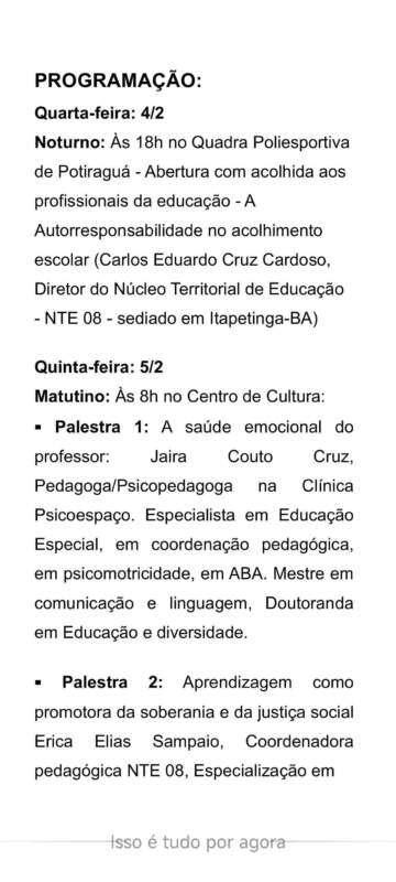 A Prefeitura do município de Potiraguá, através da Secretaria de Educação, dará início à Jornada Pedagógica nesta quarta-feira, 4 de fevereiro, e vai até o dia 6.