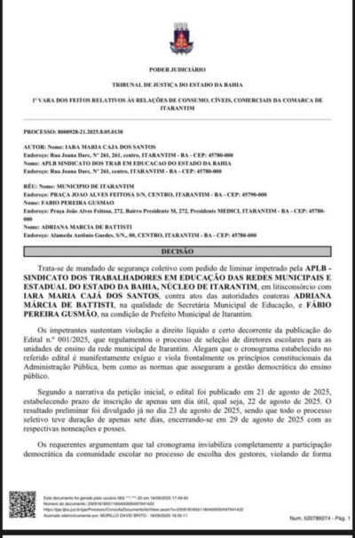Itarantim: Justiça suspende edital de seleção para diretores escolares após ação da APLB