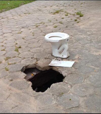 Indignação em Maiquinique: Vaso sanitário marca buraco em rua Beira Rio