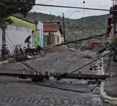 Urgente em Macarani: chuva com vento forte derrubou um muro e deixou dois postes de energia caídos em uma rua, dificultando a passagem de ...