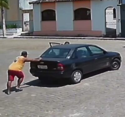 Abandonado, carro da Câmara de Vereadores de Potiraguá é flagrado sendo empurrado em rua da cidade