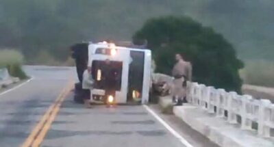 Potiraguá: Imagem mostra caminhão de eucalipto tombado na ponte do rio Pardo