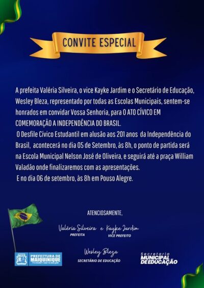 CONVITE] Prefeitura de Maiquinique convida população para Ato Cívico em comemoração a Independência do Brasil