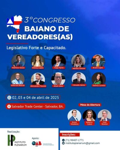 Prepare-se para três dias de aprendizado e troca de experiências no 3º Congresso Baiano de Vereadores(as), que acontecerá nos dias 02, 03 e 04 ... -