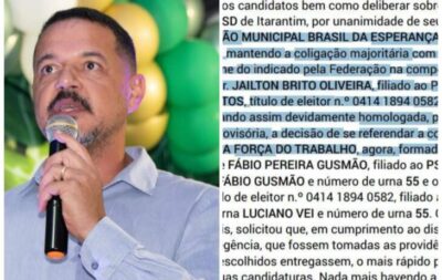 O prefeito de Itarantim, Fábio Gusmão (PSD), de forma definitiva substituiu o ex-secretário de administração, Jai Oliveira (PT) da sua chapa colocando no seu ... -