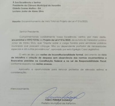 Prefeito de Itarantim veta projeto que reduziria carga horária para servidores com filhos ou parentes com necessidades especiais O prefeito de Itarantim, Fábio Gusmão, ... -