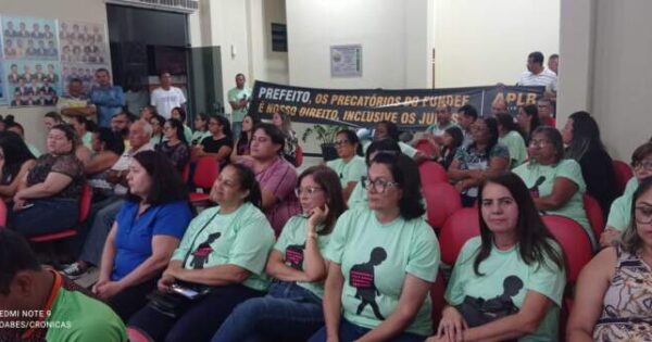 Em sessão da noite desta terça-feira professores usam faixas cobrando precatórios