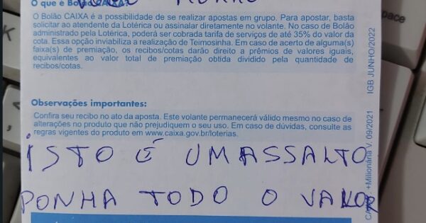 Já viu dessa? Em cidade da Bahia bandido escreve em bilhete e anuncia assalto